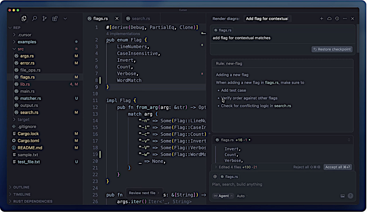 エージェントは Cursor のアシスタントで、複雑なコーディングタスクを独立的に完遂したり、ターミナルコマンドを実行したり、コードを編集することができます。