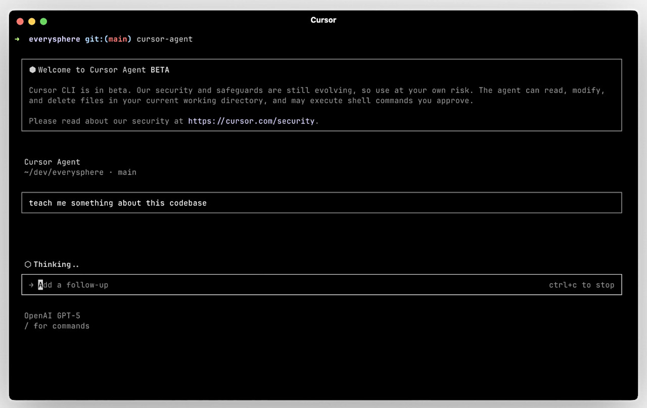 Cursor CLI はターミナルから AI エージェントと直接やり取りして、コードを作成、レビュー、変更することを可能にします。インタラクティブなターミナル・インターフェイスを望む場合でも、スクリプトや CLI パイプラインの出力自動化を望む場合でも、この CLI は強力なコーディングアシスタントを作業する場所で提供します。